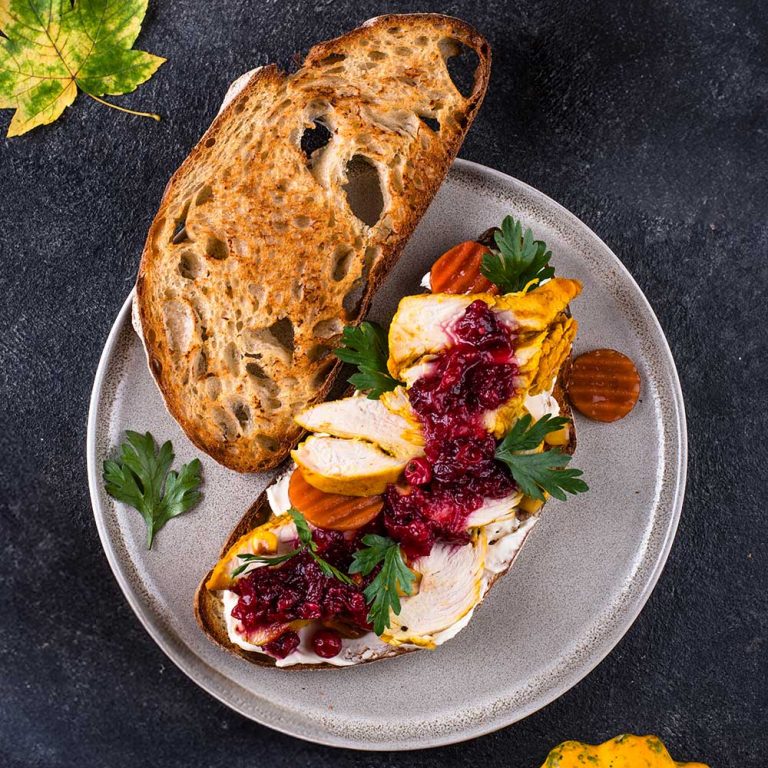 Wer mag, gibt als unterste Lage jeweils eine Scheibe Käse. Und wenn noch Bratensoße übrig ist, kann man diese leicht erwärmen und etwas davon als Topping auf die Cranberrysoße geben, bevor die zweite Brotscheiben aufgelegt wird.