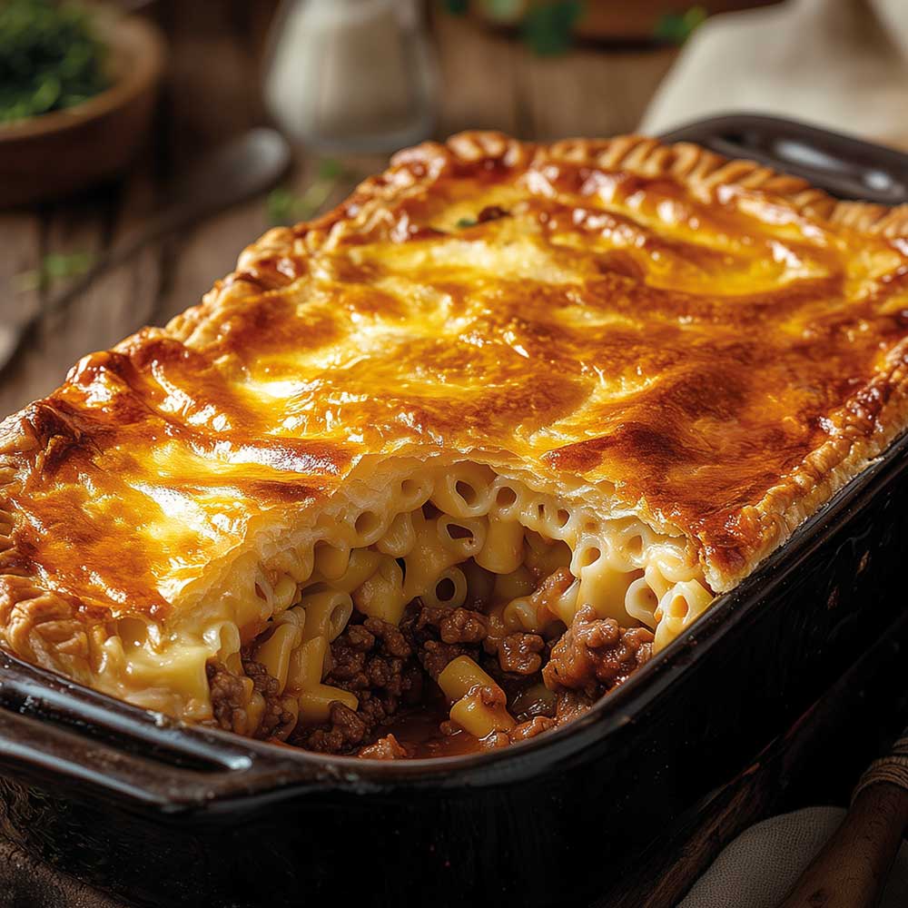 Die Hälfte der Makkaroni auf den Blätterteig auslegen, mit Hackmasse bedecken und mit der Hälfte des Käse bestreuen. Eierscheiben darauf verteilen. Die restlichen Nudeln darübergeben und mit dem Rest Käse bestreuen. Die restlichen Eier verquirlen, mit Salz und Pfeffer würzen und über den Auflauf geben. Die beiden anderen Blätterteigplatten übereinanderlegen, wieder in Größe der Form ausrollen und oben auf den Auflauf legen. Das Eigelb verquirlen, den Blätterteig damit bestreichen und im Ofen für 20 Minuten backen, bis das Timpana goldbraun ist. Dazu passt ein grüner Salat.
