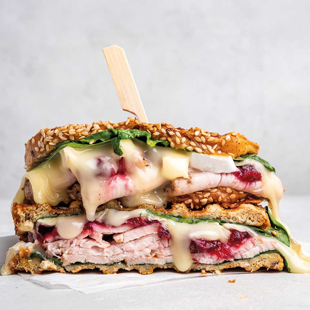 Die Cranberry-Essig-Mischung auf den Broten verstreichen. Die Hälfte der Brotscheiben mit dem Truthahnfleisch, Brie und Spinat belegen. Die andere Hälfte der Brote auf die belegten Scheiben legen. Die Oberseite der Brote mit Öl bestreichen und die Sandwiches auf ein mit Backpapier belegtes Backblech legen.