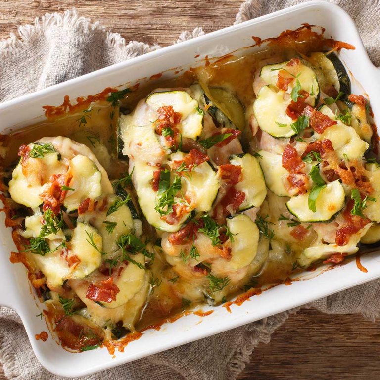 In derselben Pfanne erneut etwas Öl erhitzen und die Zucchinischeiben kurz anbraten. Hähnchenbrüste in eine Auflaufform legen. Gemüsebrühe angießen. Mit Zucchinischeiben belegen, dann Bacon darauf verteilen und mit Käse bestreuen.