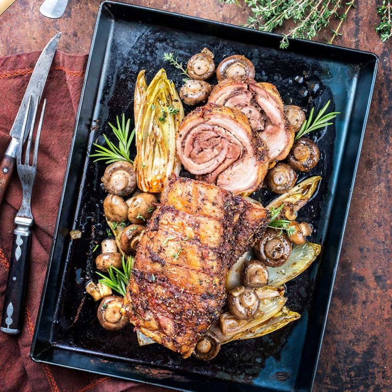 Pilze putzen und Chicorée längs vierteln. Mit Olivenöl, Salz und Pfeffer vermengen. 30 Minuten vor Ende der Garzeit auf ein Blech geben und im Ofen rösten, bis die Pilze goldbraun und der Chicorée leicht karamellisiert sind. Rollbraten vor dem Aufschneiden einige Minuten ruhen lassen. Soße durch ein Sieb gießen, etwas einkochen und abschmecken. Dazu passen Kartoffelgratin oder Rosmarinkartoffeln.